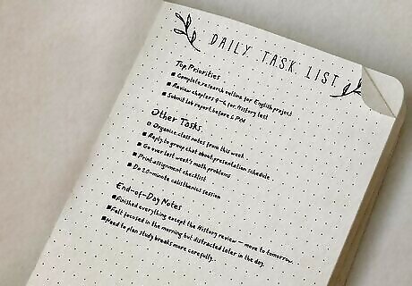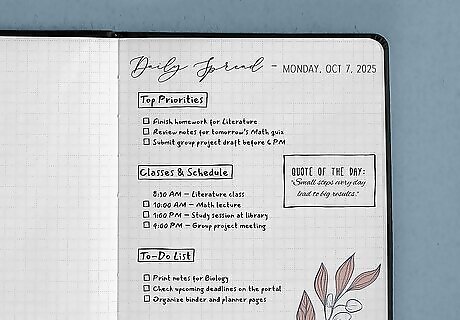 Daily spread Daily spreads are helpful ways to track each day of the week and what you have going on. Make a new page for each day, and list out the main things that are happening, such as tasks you want to get done, classes, or appointments. List your top priorities that you want to finish so you’re committed to completing them. You can also include information in your spread about the day of the week, the weather, how you’re feeling, and whatever else you feel is important and want to write down.