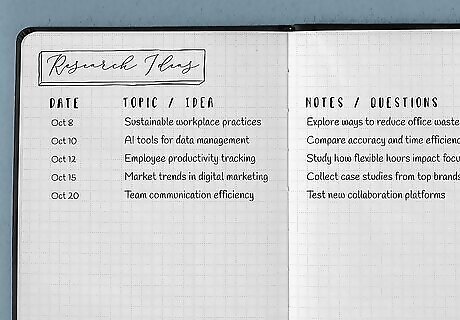 Research ideas If there are areas in your job where you want to poke around and learn more, dedicate a page in your journal to the ideas that come into your head. That way, you remember to bring them up with your supervisor or during a meeting.