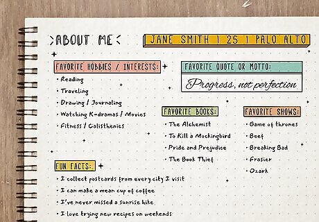 About me Early in your bullet journal, include a welcome page about yourself that goes into some of your personal details. Write down things like your name, your height, where you live, what you like to do, and a few fun facts about yourself. Don’t forget to include a drawing or photo of yourself somewhere on the page too.