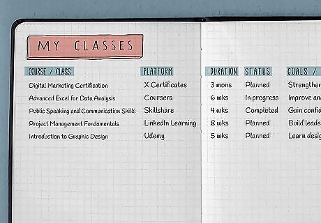 Classes or continued education If some classes or certifications can help you achieve the career you want, write down what you want to keep learning. List out any classes that you hope you hope to take and make a plan so you can keep setting yourself up for success.