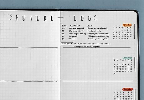 Future log/calendar page The calendar page lets you visualize the rest of your year and plan ahead for your future. Draw a calendar for each month on a few pages of your bullet journal and highlight important days, such as upcoming events, birthdays, holidays, or anything else of note, so you can see what’s happening at a glance.