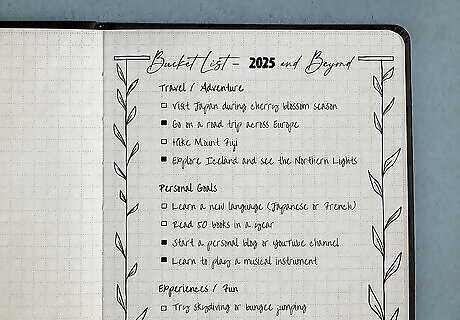 Bucket list Do you have things that you want to achieve before you eventually “kick the bucket?” Make a list of dreams and accomplishments that you hope to do at some point in your life. You could even draw a picture of a bucket split into sections for each achievement, and color them in as you complete them.