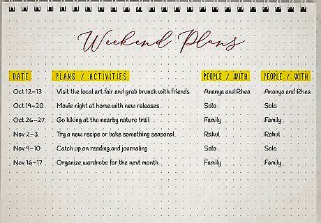 Weekend plans At the start of the week, jot down fun activities and plans that you want to get done during the weekend. When the week starts to bog you down, flip to this page so you can remember what you have to look forward to when the weekend rolls around.