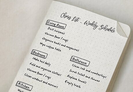 Chores list Make lists for each room at home and what cleaning and organizing needs to get done for each one. Mark which days you want to complete your chores so you can get into a regular habit and fit them into your schedule.