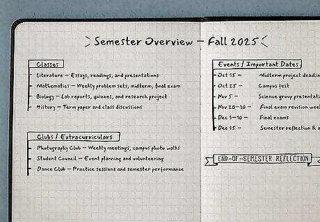 Semester overviews Write down all the classes, clubs, and events that you know are happening during the semester so you know what to look forward to. Alternatively, you can make overviews at the end of a semester to reflect on what you learned and the accomplishments you achieved.