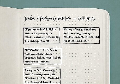 Teacher and professor contact info Organize the information for each of your teachers on a single page so you can quickly contact them. Include their email address and any office hours they have so you know when you can visit them in person.