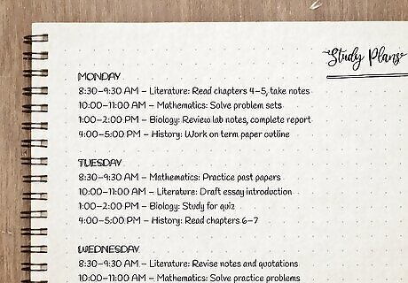 Study plans Block out times for when you want to study each subject and mark it down on a daily or weekly calendar. Choose start and end times for your study sessions, and write down what materials you need to study so they’re fresh in your mind.