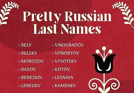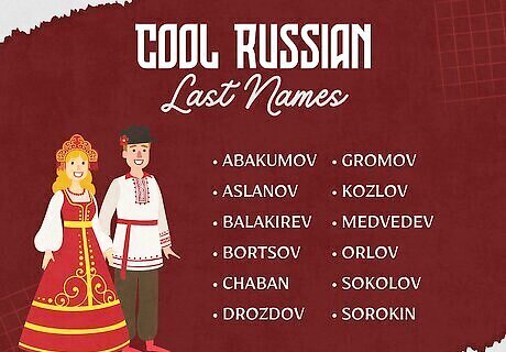 These Russian surnames symbolize animals, nature, and strong concepts. Surnames, like Gromov and Volkov, sound edgy and evoke stereotypically masculine elements. Here are other cool Russian surnames, plus their meanings: Abakumov - Means “son of Abakum” or “to wrestle.” Alatortsev - Means “artisan” or “tradesperson.” Aslanov - Means “son of Aslan,” with Aslan meaning “lion” in Turkic and Persian. Balakirev - Means “stubborn child.” Bortsov - Means “son of Bort,” which can refer to “fencing” or “a stand of trees.” Chaban - Means “shepherd.” Drozdov - Means “blackbird.” Gromov - Means “thunder.” Kozlov - Means “goat.” Medvedev - Means “bear.” Orlov - Means “eagle.” Sokolov - Means “falcon” or “hawk.” Sorokin - Means “magpie.” Volkov - Means “wolf.” Zaitsev - Means “hare.”