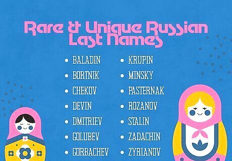 Baladin, Bortnik, and Krupin are some of the rarest Russian surnames. Although the following surnames are relatively uncommon, you might come across them from time to time. Some hold strange meanings, while others are simply outdated. Here’s a quick list of rare and unique options: Baladin - Means “a small crater on the moon.” Beles - Means “kind” or “nice.” Bortnik - Means “beekeeper.” Chekov - Means “Czech.” Devin - Means “sorcerer” or “fortune teller.” Dmitriev - Means “son of Dmitry.” Golubev - Means “dove” or “pigeon.” Gorbachev - Means “hunchback.” Krupin - Means “barley” or “grain.” Minsky - Means “from Minsk,” the capital of Belarus. Pasternak - Means “parsnip.” Rozanov - Mean “of the rose.” Stalin - Means “man of steel.” Zadachin - Means “good luck.” Zolotov - Means “gold.” Zyrianov - Refers to the Zyryan people.