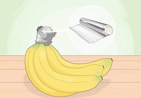 Foil and plastic wrap trap gases that ripen bananas. Bananas continue to ripen after you buy them. Once you get home, secure a large piece of aluminum foil or plastic wrap around the tops of the stems. This will slow the release of ethylene gas, so your bananas will stay fresh for a longer time than usual. You can either wrap the stems of the entire bunch, or separate the bananas to wrap them individually. If your bananas already came with plastic wrap around the stems, leave it on until you’re ready to eat them.