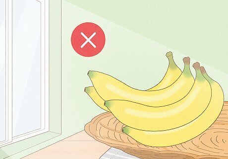 Bananas turn brown faster in warm, sunny spots. Chef Woodward says, “Keeping [bananas] refrigerated or in a dark, cool area of the kitchen [will] make them last longer.” Store your bananas in a cool, dry area that stays around 54 °F (12 °C). Make sure the spot doesn’t get any direct sunlight during the day because the sun could cause them to ripen faster before you have a chance to eat them. Rather than keeping bananas in your kitchen, you may have more luck storing them in a pantry closet or your basement.