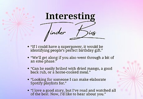 Highlight your personality and interests. When writing your Tinder bio, Diamond says, “The most important thing is to make a profile that represents your interests, lifestyle, and personality, [and is] very clear about why you’re on Tinder.” A bio that’s interesting to you will also be interesting to the right person. Here are some examples to give you some ideas: “If I could have a superpower, it would be identifying people’s perfect birthday gift.” “We’ll get along if you also went through a bit of an emo phase.” “Can be easily bribed with dried mango, a good back rub, or a home-cooked meal.” “The great white shark has a mating call that can be heard 40 km away. I have a Tinder profile with a reach of 100 km. Suck on that, you dumb shark and your million years of evolution.” “Currently developing an obsession with an obscure subject so I can distract myself from my issues for the next 4-6 months.” “Looking for someone I can make elaborate Spotify playlists for.” “If you can guess my favorite flavor of ice cream, you win bonus points. If you can guess what toppings I’d choose, I’ll propose.” “I love a good story, but I’ve read and watched all of the best. Now, I’d like to hear about you.” “The key to my heart is letting me win at board games—or at least helping me improve my skills.” “My hidden talent is my ability to do a great impression. What’s yours?” “I’m like a second-hand shop—full of weird stuff but worth a rummage.” “I love connecting with new people over a good conversation. Ask me anything about craft beer and [favorite band’s] discography.” “Things I have strong opinions on: Looking at the menu ahead of time before a date, Apple Music, and dill pickles.” “I’ll try anything once: sashimi, pickleball, even that movie from your Letterboxd.” “I want to know your favorite song, but to tell me, you have to sing it to me.” Meet the wikiHow Experts Maya Diamond, MA, is a dating and relationship coach in Berkeley, CA. She has over 15 years of experience helping singles create loving, lasting partnerships. Julianne Cantarella is a dating coach and the CEO and president of New Jersey’s Matchmaker. She has over a decade of experience helping women heal from heartbreak and create healthy, long-term relationships. Lisa Shield is a dating coach based in Los Angeles, CA. She has over 17 years of experience helping people find and maintain healthy relationships. Laura Bilotta is a dating coach, matchmaker, and the founder of Single in the City, a dating and relationship coaching service based in Toronto, Canada. She has over 21 years of experience helping singles date more intentionally. Renee Slansky is a dating, relationship, and life coach based in Europe. She has collaborated with many dating apps, like eHarmony and Plenty of Fish, and runs one of the top 30 relationship blogs worldwide.