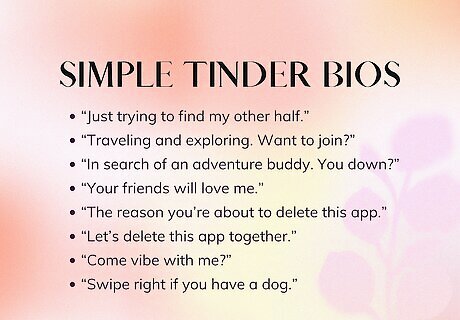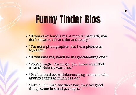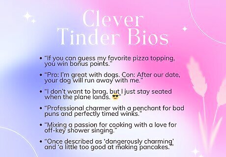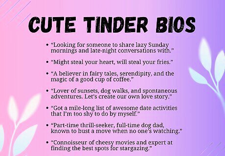 Sweep your matches off their feet with a cute bio. It’s fun to be flirty and crack jokes, but some people are more attracted to sincerity. Think about what you’re truly looking for and put a quirky spin on it to attract matches who want the same thing. Here are some examples: “Looking for someone to share lazy Sunday mornings and late-night conversations with.” “Might steal your heart, will steal your fries.” “A believer in fairy tales, serendipity, and the magic of a good cup of coffee.” “Lover of sunsets, dog walks, and spontaneous adventures. Let’s create our own love story.” “Got a mile-long list of awesome date activities that I’m too shy to do by myself.” “A lover of midnight snacks and spontaneous adventures. Always up for a good laugh and a little bit of trouble.” “Master of dad jokes, appreciator of all things spicy, and perpetually in search of the perfect burger.” “Part-time thrill-seeker, full-time dog dad, known to bust a move when no one’s watching.” “Connoisseur of cheesy movies and expert at finding the best spots for stargazing.” “Expert at making weekend brunch and pretending to know what I’m doing in the gym.” “Should we go get a pizza for our first date, or is that too cheesy?” “Why pick flowers when you can just pick me?” “Big movie person, big spending-time-with-family person, big get-to-the-airport-three-hours-early person.” “One thing about me is I’m pretty much always down for a sweet treat.” “Boyfriend/girlfriend applications now open: Inquire within.”
