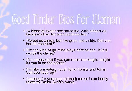 Show off your personality to attract the right person. If you’re interested in men, dating coach Lisa Shield suggests, “Have a man that you really respect read your profile because women and men think differently, and there are things that we say as women that are just a blatant turnoff to men.” Be yourself, but think of your audience and who you’re trying to attract. Here are some example “A blend of sweet and sarcastic, with a heart as big as my love for oversized hoodies.” “Sweet as candy, but I’ve got a spicy side. Can you handle the heat?” “I’m the kind of girl who plays hard to get… but is worth the chase.” “I’m a tease, but if you can make me laugh, I might let you in on the secret.” “I’m like a mystery novel, full of twists and turns. Can you keep up?” “Looking for someone to break me so I can finally relate to Taylor Swift’s music.” “Let’s plan how I’ll soft-launch you on my IG in a few weeks.” “Looking for the Mr. Darcy to my Elizabeth Bennet.” “A lover of libraries, iced lattes, and perhaps, you.” “Seeking someone to be my chauffeur as I become your passenger princess.” “I’m just a girl, standing in front of a boy, asking him if he’s going to eat the rest of that cake.” “If you were a breakfast food, what would you be? I’m bottomless mimosas, obviously.” “Warning: Having me as a girlfriend is not for the weak.” “If this doesn’t work out, at least we’ll both gain an Instagram Story viewer forever.” “Literally just trying to go to a pumpkin patch this fall, ngl.”