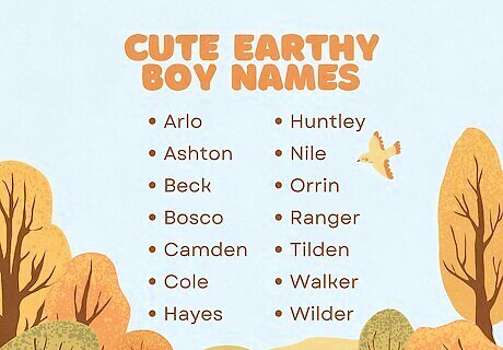 What’s in an “earthy” boy name? We’ll start with names inspired by the Earth and the natural world as a whole—from rocks and plants to geographical features, like meadows, cliffs, and everything in between. Here’s our list of earthy names for boys: Aaron - Hebrew origin, meaning “mountain of strength; strong; warrior lion” Ajax - Greek origin, meaning “Earth” or “land” Alan - Celtic and French origin, meaning “little rock” or “deer” Bradley - English origin, meaning “broad meadow” Brent - English and Celtic origin, meaning “hill” or “high place” Clay - English origin, meaning “clay settlement” or “clay worker” Cliff - English origin, meaning “steep rock face” Clive - Old English origin, meaning “cliff” Daichi - Japanese origin, meaning “great Earth” Dale - Old English origin, meaning “valley” Dusty - English origin, meaning “dusty area”; also a nickname for “Dustin,” which is Old Norse for “Thor’s stone” Elwood - English origin, meaning “old forest” Eoghan - Gaelic origin, meaning “born of the yew tree” Everest - English origin, meaning “dweller on the Eure river”; also the name of the world’s tallest mountain Ferris - Gaelic origin, meaning “of iron” Flynn - Irish origin, meaning “ruddy” or “red” Geo - Greek origin, meaning “earth” George - Greek origin, meaning “earthworker” Greene - English and Irish origin, meaning “at the green” Harley - English origin, meaning “hare’s meadow” Heath - English origin, meaning “untilled land” or “the heathland dweller” Hollis - English origin, meaning “dweller near the holly trees” Jasper - Persian origin, meaning “precious stone” Kshitij - Sanskrit origin, meaning “born of the earth” Lance - German and French origin, meaning “land; spear” Lee - English, Irish, and Chinese origin, meaning “pasture, meadow; plum” Lachlan - Irish and Scottish origin, meaning “from the land of the lakes” Lin - Chinese, British, and Greek origins, meaning “forest; fine jade; linden hill” Kailash - Sanskrit origin, meaning “mountain; abode of the gods” Keith - Gaelic origin, meaning “wood; from the battleground” Peter - Greek origin, meaning “rock, stone” Pierce - Greek origin, meaning “rock, stone” Rocky - German and British origin, meaning “rook, crow” (also referring to rocky areas) Shan - Hebrew, Arabic, Chinese, and Welsh origin, meaning “God is gracious; mountain; noble; high status” Terran - English origin, meaning “Earth-man” or “of the Earth” Teryn - English and Greek origin, meaning “harvest, summer” Vance - English and French origin, meaning “marshland” Warren - French origin, meaning “park-keeper”