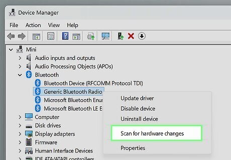 Reinstall your Bluetooth adapter. If you can't get Bluetooth to work at all on your Windows 11 computer, or your Bluetooth devices aren't staying paired, reinstalling the adapter will often fix the problem. Here's what you'll need to do: Open Device Manager and click the Bluetooth category. Right-click the Bluetooth adapter, then navigate to Uninstall device > Uninstall. Restart your computer. If the driver isn't automatically reinstalled, go back to your Bluetooth adapter in Device Manager, right-click it, and choose Scan for hardware changes.