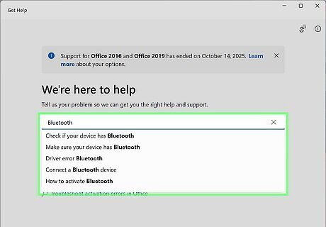 Run the Bluetooth troubleshooter. If you can't turn on Bluetooth, or you're unable to pair a device, the troubleshooter will help you fix the problem. To use the troubleshooter: Open the Get Help app by pressing the Windows key, typing help, and clicking Get Help in the search results. Type "Bluetooth" into the field in the middle of the page. At the top of the results page, you'll see a request for permission to run diagnostics to fix Bluetooth issues on your computer. Click Yes and allow the troubleshooter to run.
