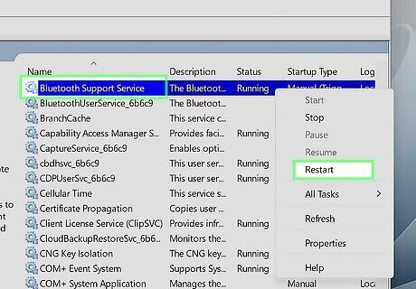 Restart the Bluetooth service. To do this, press ⊞ Win+R to open Run, then type "services.msc" into the text field and click ↵ Enter. Scroll down and find "Bluetooth Support Service." Right-click on it and choose Restart.