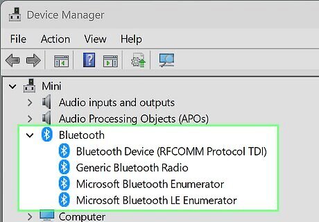 Make sure your PC supports Bluetooth. Most modern Windows PCs that are capable of running Windows 11, especially laptops, come with Bluetooth capability. However, it's possible your computer does not have a Bluetooth adapter built in. You can search the web for your model of your computer and the word "Bluetooth" to see if it's listed in the specs. You can also open Device Manager and see if there's a Bluetooth adapter listed. Here's how: Right-click the Windows menu and select Device Manager. Click the arrow next to "Bluetooth." If there is no Bluetooth adapter listed, or if there isn't a category for Bluetooth at all, you cannot turn on Bluetooth. However, you can add Bluetooth to your Windows PC by plugging in a Bluetooth adapter. You can find Bluetooth adapters on Amazon, as well as in many computer supply stores.