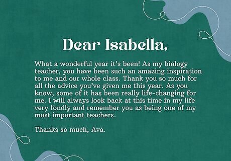 To a teacher Dear [Name], What a wonderful year it’s been! As my [subject] teacher, you have been such an amazing inspiration to me and our whole class. Thank you so much for all the advice you’ve given me this year. As you know, some of it has been really life-changing for me. I will always look back at this time in my life very fondly and remember you as being one of my most important teachers. Thanks so much, [Name]