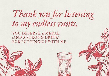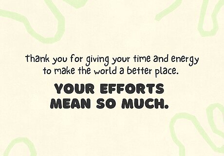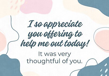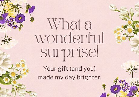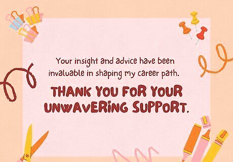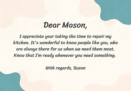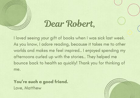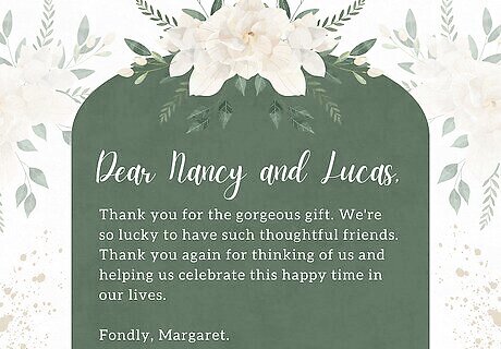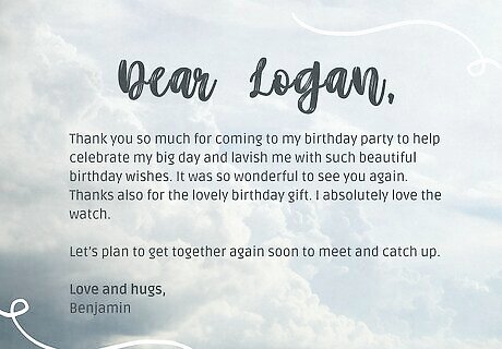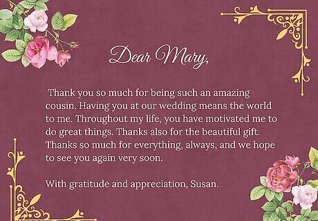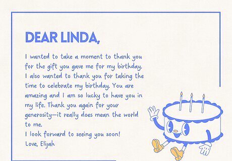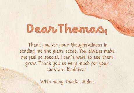 State the specific reason you’re thanking them. According to Claytor, "the first rule of thumb is always say thank you first." She goes on to recommend “being very specific about what you're thanking this person for." Keep the focus on them while you say thank you with details that show why you’re grateful, even if you’re just saying “thank you for all you do.” Some examples are ahead: Thank you so much for the very generous gift card. You are the best friend anyone could ask for. I so appreciate your making the long trek to help us celebrate our wedding. I loved having you there and am thankful for your presence. From Claytor: “Thank you, [Name], for the beautiful [gift] that you gave me for [holiday or occasion]. You really took the time to make sure that I would like it. It's my favorite color, [color]. It was great seeing you again and spending time with you. I hope to see you again soon.” It’s also important to let them know “how you're going to utilize whatever this person did for you,” says Claytor. For instance, if they bought you a computer when you graduated high school, tell them how you’ll use it when taking all of your classes.