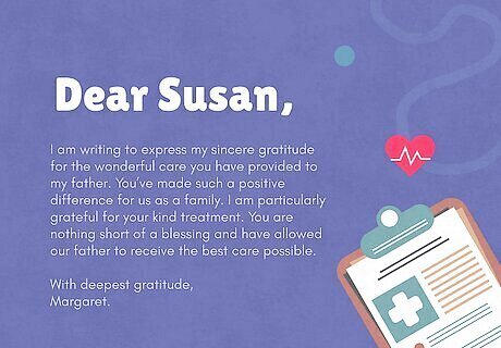To a caregiver Dear [Name], I am writing to express my sincere gratitude for the wonderful care you have provided to my [loved one's name]. You’ve made such a positive difference for us as a family. I am particularly grateful for [details on their efforts]. You are nothing short of a blessing and have allowed our [loved one’s relationship] to receive the best care possible. With deepest gratitude, [Name]
