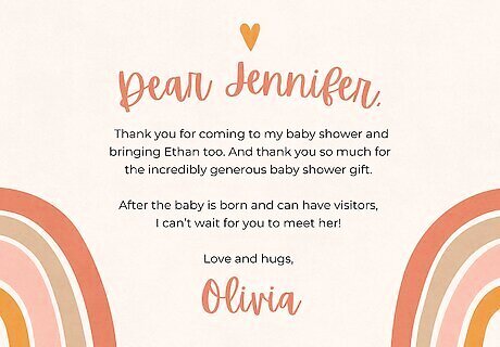 To a good friend Dear [Name], Thank you for coming to my baby shower and bringing [Name] too. And thank you so much for the incredibly generous baby shower gift. [Mention specific details about the gift and how you’ll use it]. After the baby is born and can have visitors, I can’t wait for you to meet [him/her]! Love and hugs, [Name]
