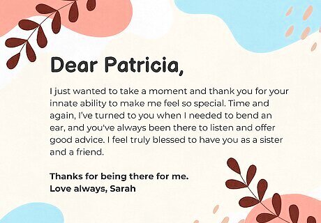 To a sibling Dear [Name], I just wanted to take a moment and thank you for your innate ability to make me feel so special. Time and again, I’ve turned to you when I needed to bend an ear, and you've always been there to listen and offer good advice. I feel truly blessed to have you as a [sister/brother] and a friend. Thanks for being there for me. Love always, [Name]