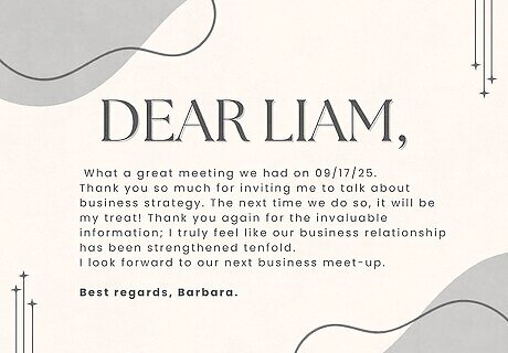 To a client Dear [Name], What a great meeting we had on [date]. Thank you so much for inviting me to talk about business strategy. The next time we do so, it will be my treat! Thank you again for the invaluable information; I truly feel like our business relationship has been strengthened tenfold. I look forward to our next business meet-up. Best regards, [Name]