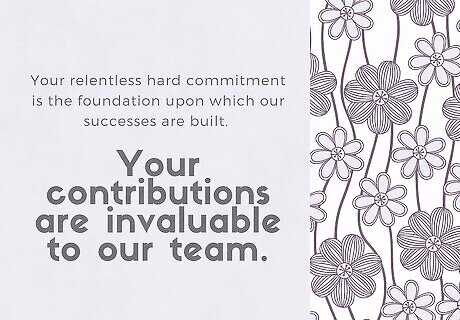 To an employee Dear [Name], We’d like you to know how much we value your talents, skills, and stellar job performance. Your hard work, dedication, and support have helped our company grow beyond what we could have imagined just a little while ago. Thank you for your leadership and company loyalty. It encourages the company as a whole every day you show up to work. Cheers, [Name]