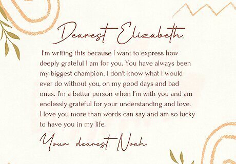 To a significant other Dearest [Name], I'm writing this because I want to express how deeply grateful I am for you. You have always been my biggest champion. I don't know what I would ever do without you, on my good days and bad ones. I’m a better person when I’m with you and am endlessly grateful for your understanding and love. I love you more than words can say and am so lucky to have you in my life. Your dearest, [Name]