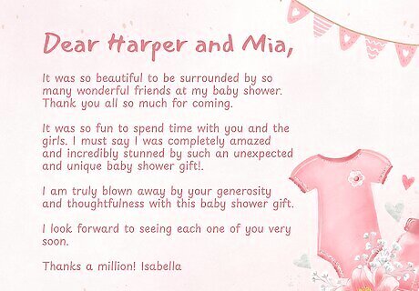 To a group of friends Dear [Names], It was so beautiful to be surrounded by so many wonderful friends at my baby shower. Thank you all so much for coming. It was so fun to spend time with you and the [girls/guys]. I must say I was completely amazed and incredibly stunned by such an unexpected and unique baby shower gift! [Specific details about the gift]. I am truly blown away by your generosity and thoughtfulness with this baby shower gift. I look forward to seeing each one of you very soon. Thanks a million! [Name]