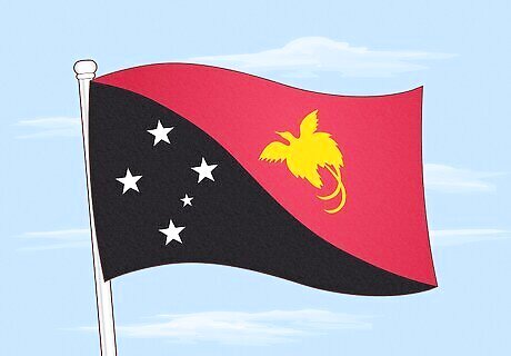 Papua New Guinea Papua New Guinea’s flag is diagonally split into two sections—the rightmost section is red and the leftmost section is black. On the red field, there’s a golden silhouette of a flying bird, specifically the Raggiana bird-of-paradise. On the black field, there are five white stars that form the Southern Cross constellation. The black and red colors are traditional of many Papua New Guinean tribes, while the bird-of-paradise symbol is borrowed from the country’s national coat-of-arms. The Southern Cross is a common symbol on many national flags from the Southern Hemisphere, as the constellation is easily visible in their night sky. Year of Adoption: July 1st, 1971. Designer: Susan Karike, a 15-year-old who won a nationwide design competition.