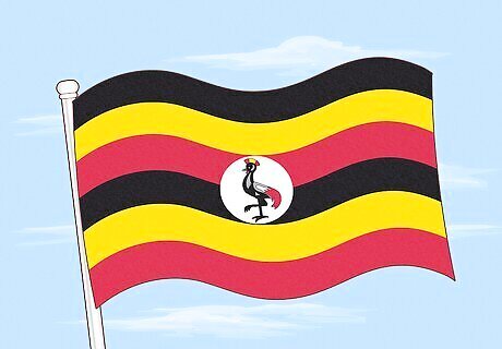 Uganda The Ugandan national flag features six equal horizontal stripes in a black, yellow, red, black, yellow, and red pattern (from top to bottom). In the center of the flag, there’s a white circle with a crane in the middle. The crane is depicted with black, grey, white, red, and yellow colors. The crane is the official symbol of Uganda, while the black color represents the Ugandan people, the yellow represents the nation’s plentiful sunshine, and the red symbolizes brotherhood among Uganda’s citizens. The crane also stands with a raised leg, symbolizing Uganda’s forward movement toward progress, prosperity, and the future. Year of Adoption: October 9th, 1962 (date of the country’s independence from British rule). Designer: Grace Ibingira, the then-Minister of Justice.