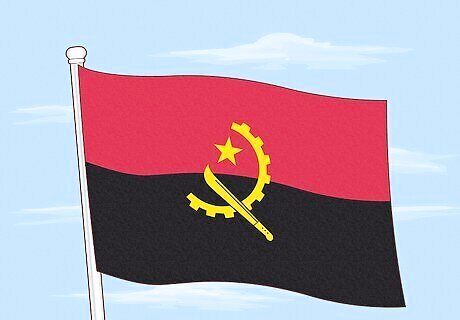 Angola The Angolan national flag is split horizontally into two equal stripes—the top one is red, and the bottom one is black. In the center of the flag, there’s a yellow emblem that depicts a gear, a star, and a machete. The black color is said to represent the continent of Africa, the yellow symbolizes wealth, and the red symbolizes both socialism (at the time of adoption) and the bloodshed during the country’s fight for independence (modern interpretation). The central emblem represents industrial workers (gear), agricultural workers (machete), and internationalism and progress (star). Year of Adoption: November 11th, 1975 (date of the country’s independence from Portugal). Designer: Henrique de Carvalho Santos (influenced by the flag used by the People’s Movement for the Liberation of Angola).