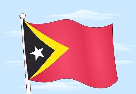 East Timor (Timor-Leste) East Timor (officially the Democratic Republic of Timor-Leste) has a mostly red flag. On the left side of the flag, there’s a yellow isosceles triangle that points to the right. On top of the yellow triangle, there’s a slightly smaller black triangle with a white star on it. Originally, the black color represented East Timor’s 400 years as a colonized and oppressed region, the yellow represented the fight for independence, the red represented bloodshed, and the white star represented hope for the future. However, as of 2002’s Constitution of the Democratic Republic of Timor-Leste, the colors officially represent obscurantism (black), wealth (yellow), struggle for liberation (red), and peace (white). Year of Adoption: May 20th, 2002 (date of the country achieving full sovereignty). Designer: Natalino Leitão.
