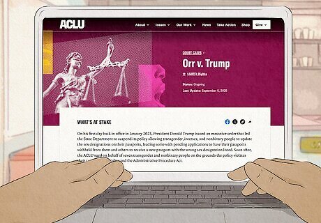 Seek help with the ACLU or Lambda Legal if you can’t get a passport. You should currently be able to get an updated passport without an issue—but, if you do end up facing issues anyway, you have legal options. The ACLU has an online intake form that you can submit for assistance. Additionally, Lambda Legal has a help desk with additional resources (although you should opt for the ACLU if it’s a time-sensitive issue).