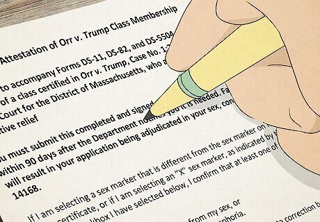 Fill out an attestation form along with your passport application. You can find an attestation form on the State Department’s travel website—specifically, on the “Sex Markers in Passports” page. Then, you’ll need to fill out the correct passport application for your situation (based on whether you’re renewing a passport or getting one for the first time). An application for a new U.S. passport requires form DS-11. A renewal application requires form DS-82. An application to change or correct your passport requires form DS-5504. If you want an “X” gender marker on your passport, do not fill in the gender selection on your main passport application. There’s no “X” option there. Instead, check the “X” marker on your attestation form.