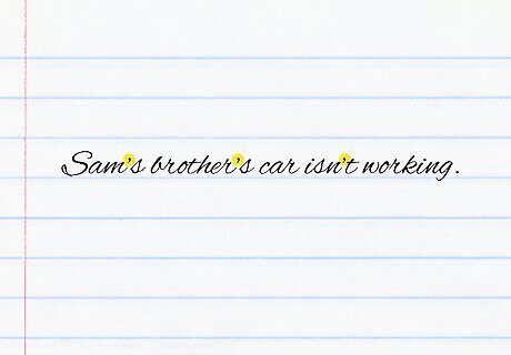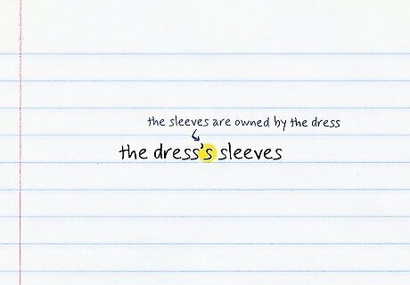 Add an apostrophe and an S to make nouns possessive. To show that a person, place, or thing owns something, add an apostrophe and the letter S to the end of the word. This applies to most singular nouns, as well as plural nouns that don’t already end in S. If a singular noun ends in S, you’ll still add another S after the apostrophe. Ex: the dog’s toy Ex: the children’s room Ex: the tree’s branch Ex: the dress’s sleeves