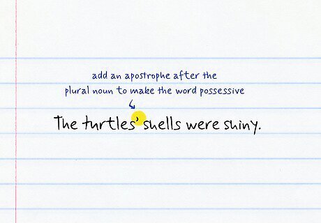 Add an apostrophe after a plural noun that ends in S. If a plural noun already ends in S, add an apostrophe after the S to make the word possessive. Because that S is already there, there is no need to add another one after the apostrophe. Ex: schools becomes schools’ Ex: dolls becomes dolls’ Ex: turtles becomes turtles’