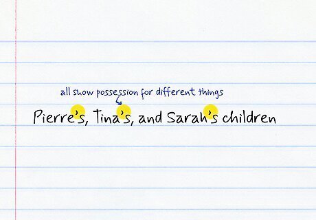 Make each noun in a group possessive if they own different things. If you have a group of nouns that all show possession for different things, add an apostrophe and the letter S to each individual noun. Ex: Lily’s and Nick’s stores Ex: Pierre’s, Tina’s, and Sarah’s children Ex: Dana’s and Valerie’s jobs