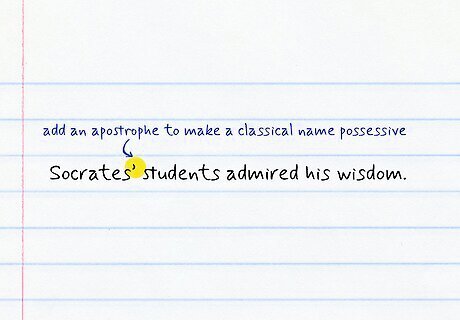 Add only an apostrophe after a classical name ending in S. According to some style guides, classical and Biblical names have their own conventions when it comes to apostrophes. If the name ends in S and has two or more syllables, only add an apostrophe to make it possessive. If it ends in an S and is only one syllable, add an apostrophe ‘s.’ Ex: Jesus’ disciples Ex: Zeus’s warning Ex: Socrates’ students
