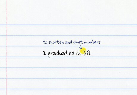 Use apostrophes to shorten and omit numbers. Similar to contractions, apostrophes can be used to omit certain numbers from a larger number. This is most often used in relation to years. Just remember that the apostrophe goes before the remaining numbers, not after. Ex: Instead of saying, “I graduated in 1998,” say “I graduated in ‘98.” Ex: Instead of writing 2007, write ‘07