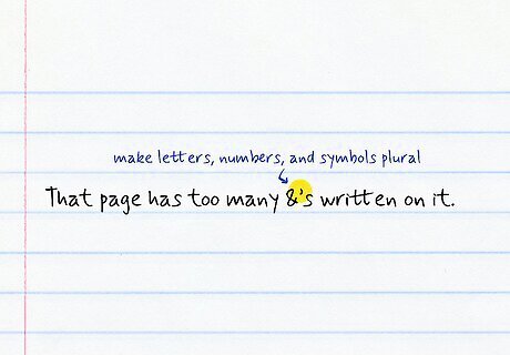 Use apostrophes to make letters, numbers, and symbols plural. While apostrophes are not used to make actual nouns or other words plural, they are used to create plural forms of individual letters, numbers, and other symbols, like ampersands. In most cases, simply add an apostrophe and an S at the end of the symbol. Ex: “I got three A’s on my report card.” Ex: “There are two 5’s in my phone number.” Ex: “That page has too many &’s written on it.” If this seems confusing for numbers, avoid the problem altogether by spelling out the word of the number, like “ones” instead of “1’s.” Only do this for numerals that are ten or lower, however.