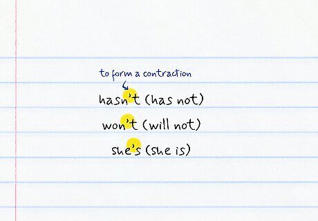 Add an apostrophe in place of missing letters to form a contraction. A contraction is a shortened form of a word or group of words that omits certain letters or sounds. In this case, the apostrophe represents those missing letters. In many cases, contractions are made up of a noun or pronoun and a verb or helping verb. Ex: hasn’t (has not) Ex: won’t (will not) Ex: she’s (she is) Avoid using contractions that don’t exist, like “shouldn’t’ve.” We often say these in real life, but they aren’t appropriate for formal writing. Be very careful with the word “it.” Use an apostrophe with the word “it” only when you want to indicate a contraction for “it is” or “it has.” “It” is a pronoun, and pronouns have their own possessive form that does not use an apostrophe.