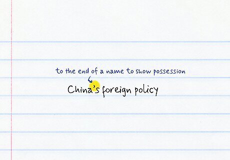 Add an apostrophe and an S to the end of a name to show possession. To make someone’s name or other proper noun possessive, add an apostrophe and an S to the end of the name. This applies to all singular names, including those that end with an S, like James. If the name is plural, like when referring to a family’s last name, add only an apostrophe. Ex: Mary’s cat Ex: China’s foreign policy Ex: Miles’s book Depending on the style guide you follow, it may be appropriate to add only an apostrophe after a name that ends with ‘s’ (ex: James’). Most style guides prefer adding an apostrophe ‘s,’ however (ex: James’s). If you’re referring to an entire family showing possession, make the name plural first. For example, the last name “Jones” would become “Joneses’”