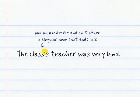 Add an apostrophe and an S after a singular noun that ends in S. Remember, if a singular noun ends with the letter S, it is still one object. Because of this, you must add an apostrophe and another S to the end to show possession. According to some style guides, it is technically okay to only add the apostrophe if it’s a proper name that ends in S, but most guides prefer adding another S at the end. Ex: the class’s Ex: Atlas’s Ex: the iris’s