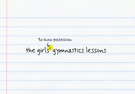 Add an apostrophe to the end of plural nouns to show possession. Most plural nouns already end in an S, so it isn’t necessary to add another S after the apostrophe. Write the plural noun as you normally would and add an apostrophe to the very end to show possession. Ex: the students’ books Ex: the houses’ roofs Ex: the girls’ gymnastics lessons
