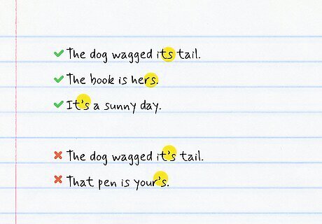 Do not use apostrophes with possessive pronouns. In general, apostrophes are the standard way to show possession, but this does not apply to pronouns. In some cases, adding an apostrophe to a pronoun would make it a contraction instead, like with the pronoun “it.” For example, “his,” “hers,” “its,” “yours,” “my,” and “ours,” are all possessive pronouns. None of them require an apostrophe to show possession. Adding an apostrophe to “it,” would make the word “it’s,” which is a contraction of “it is.”