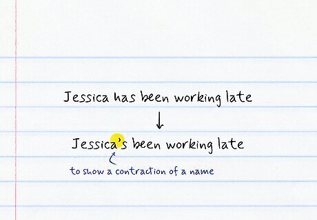 Add an apostrophe and an S to show a contraction of a name. Just as apostrophes are used to form contractions with pronouns and verbs, they can also be used to form contractions with names and other proper nouns. Add the apostrophe after the name and in place of the words or sounds you’re omitting. For example, instead of writing “Ben is coming,” you’d write “Ben’s coming.” Instead of saying “Jessica has been working late,” you’d say “Jessica’s been working late.” Instead of saying “Greg is really funny,” you’d say “Greg’s really funny.” Technically, it isn’t grammatically correct to form a contraction using a proper name, as adding an apostrophe ‘s’ is supposed to indicate possession. While this should be avoided in formal writing, it’s generally okay to use in informal writing or in conversation.